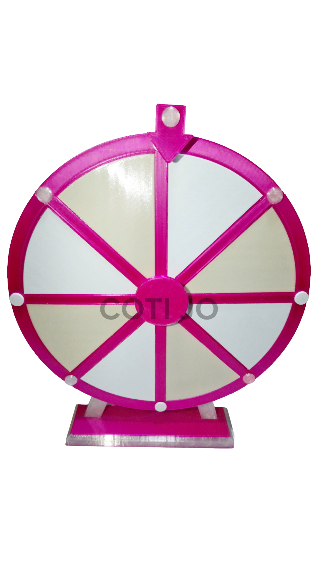 Ruleta de 30 cm de diámetro y 40 cm de altura, fabricada en plástico PLA con giro fluido y terminaciones prolijas. Incluye tapa frontal imantada y removible, ideal para colocar, pegar y despegar logos, nombres o diseños según cada evento.